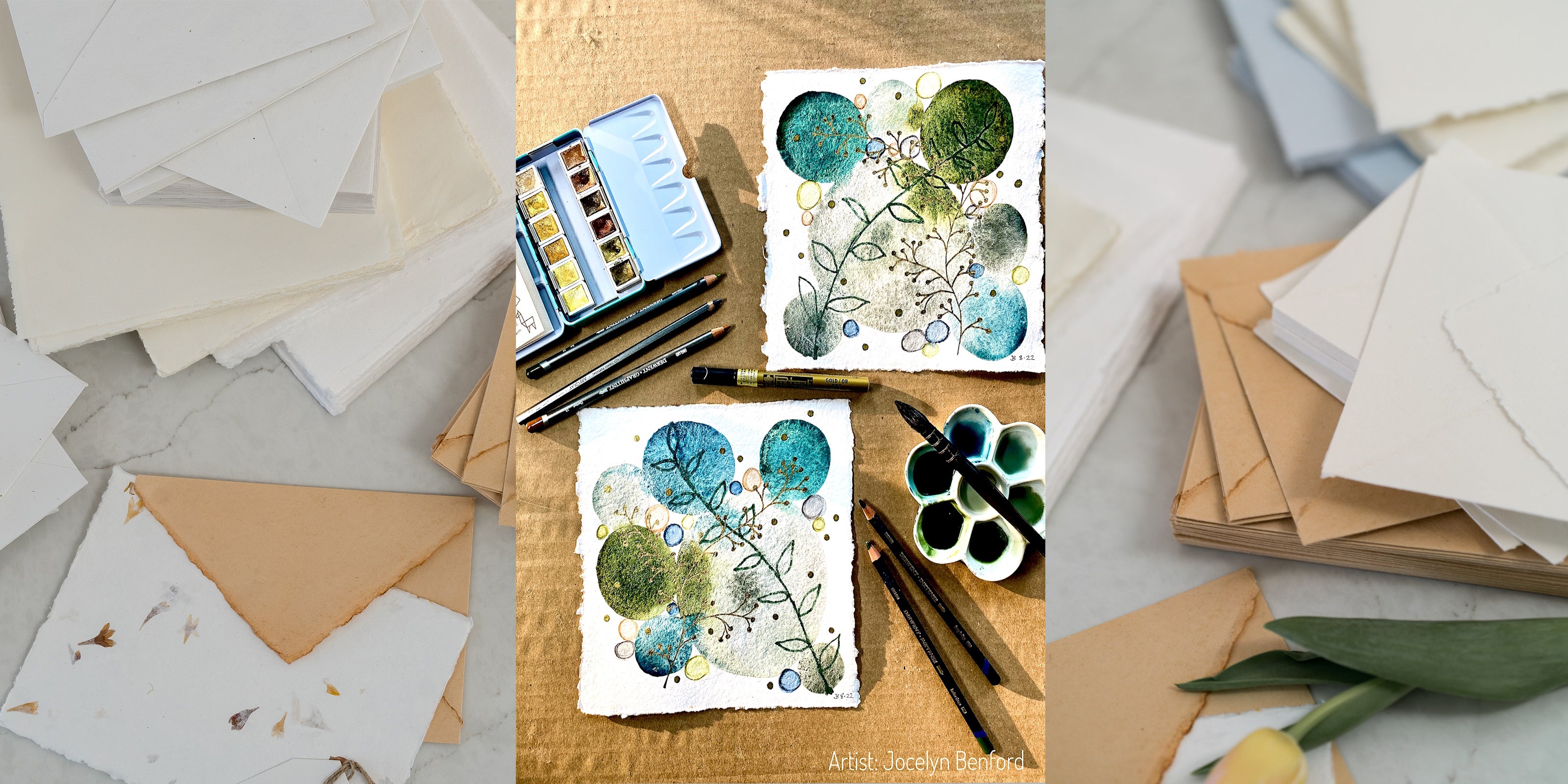 Handcrafted leather watercolor journals, available in a variety of styles and colors, featuring 350 GSM whIte deckle-edge handmade paper.
