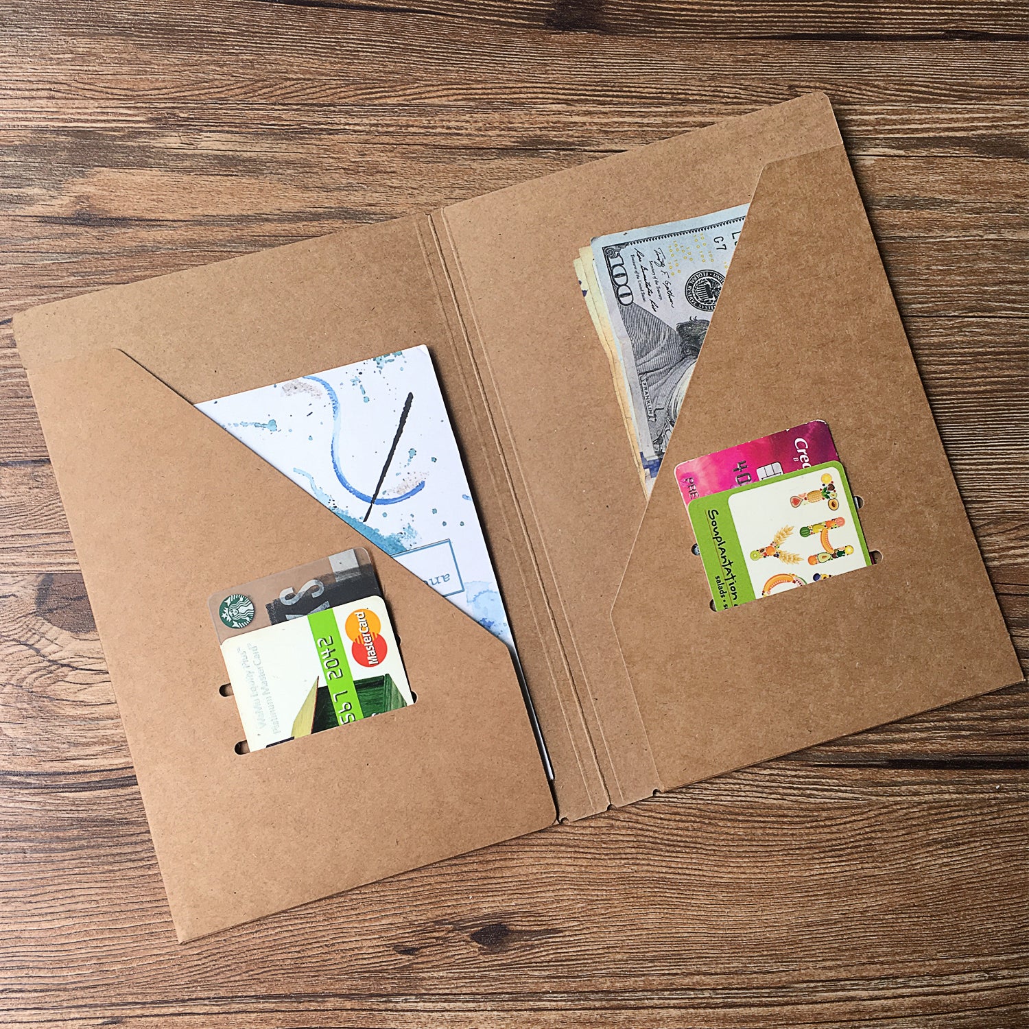 Kraft Paper Folder - contains 1 large pocket and 1 card size slot on each side.