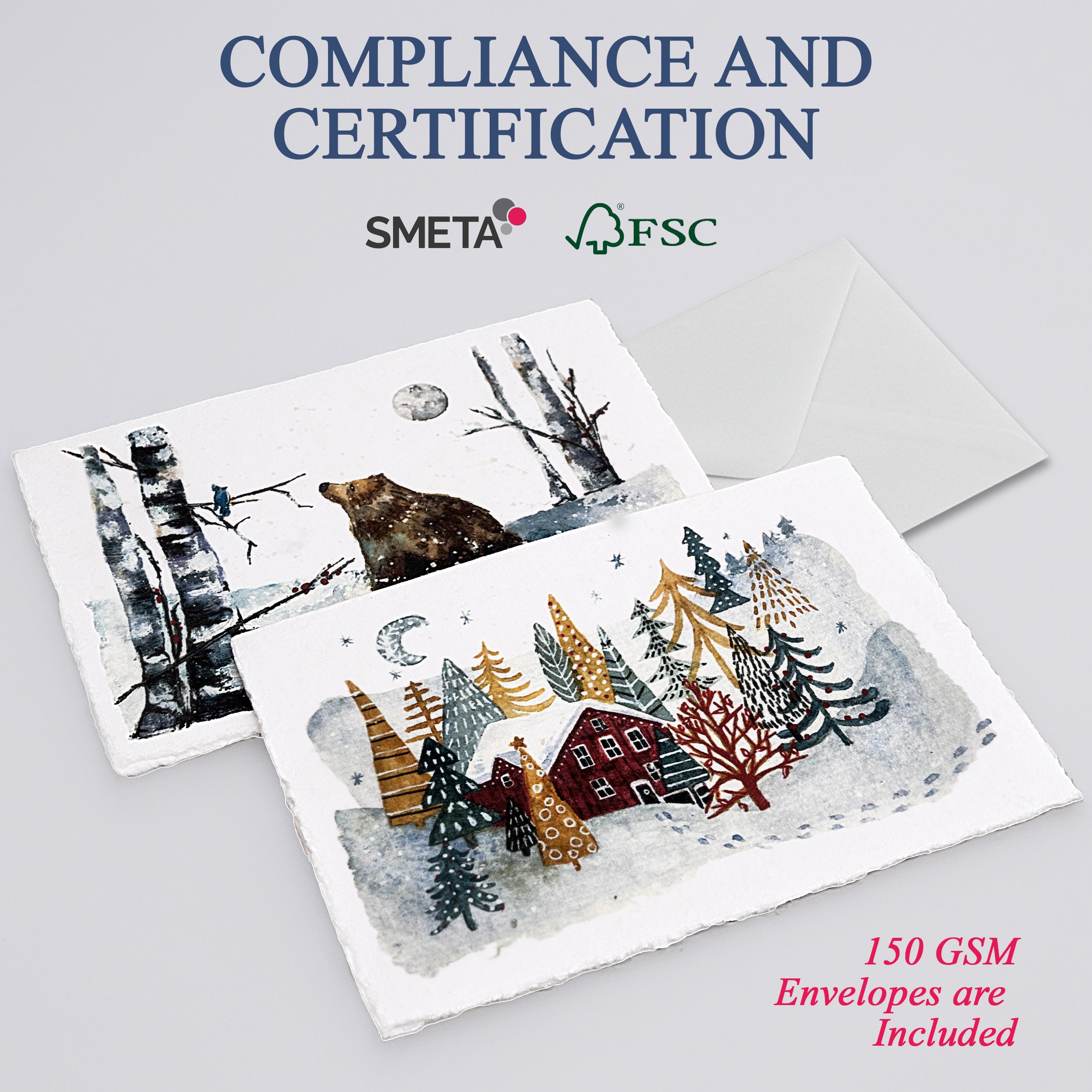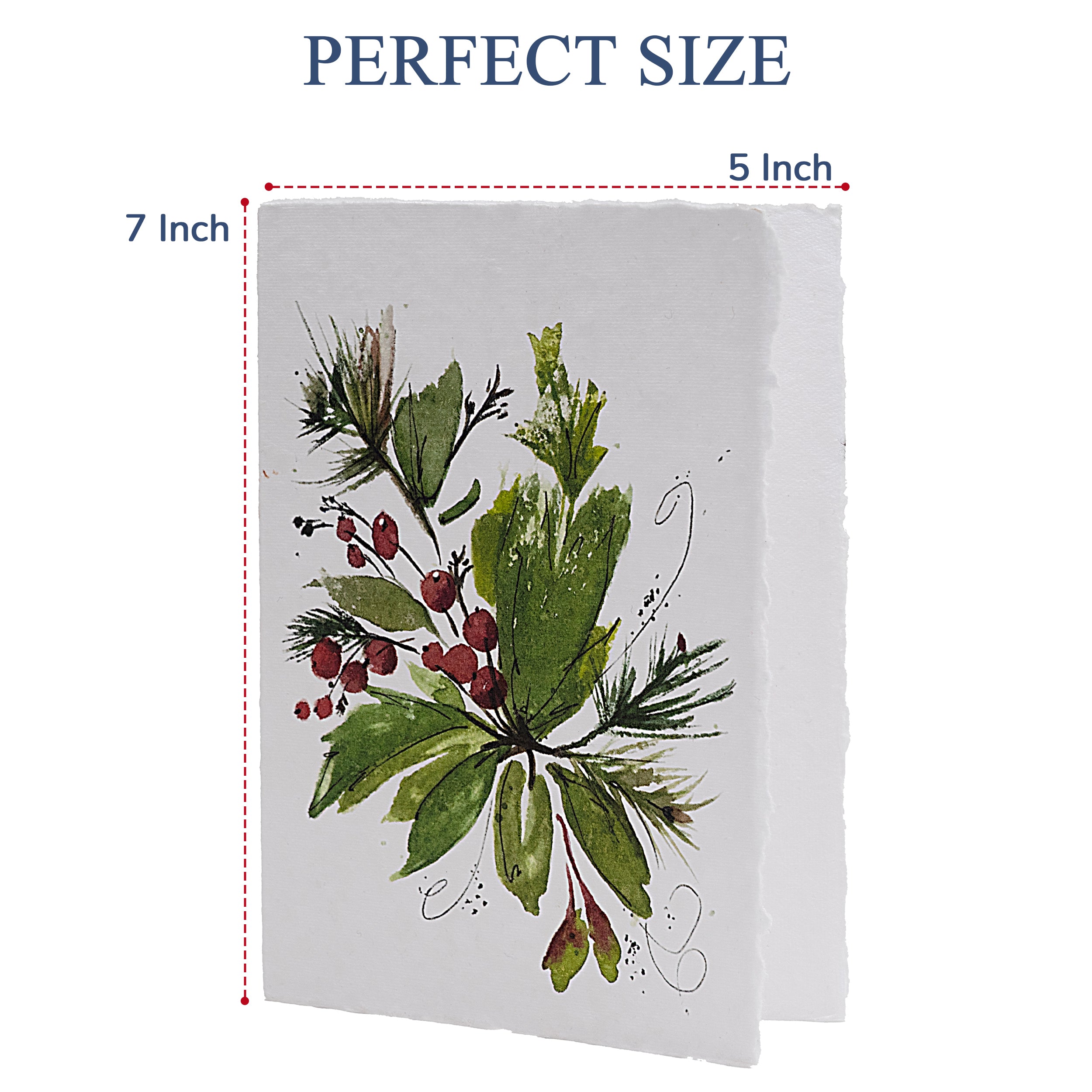 ✔️ [Artisan Crafted Variety Pack]: Discover the beauty of tradition with our 20-pack of super thick 300 gsm cotton deckled edge paper greeting cards and 150 gsm envelopes, each printed with a winter cover and folded to 5"x7" / 13x18 cm. This set includes 4 different winter covers, 5 cards of each design carefully arranged for a balanced and elegant assortment. Skillfully crafted by artisans using techniques passed down for generations in India, this white, cold-pressed textured card is ideal for crafts, light watercolor, acrylic, charcoal, ink, printers or colored pencils. For heavy washes and extensive water use, we recommend our watercolor paper: B0CYY858SL