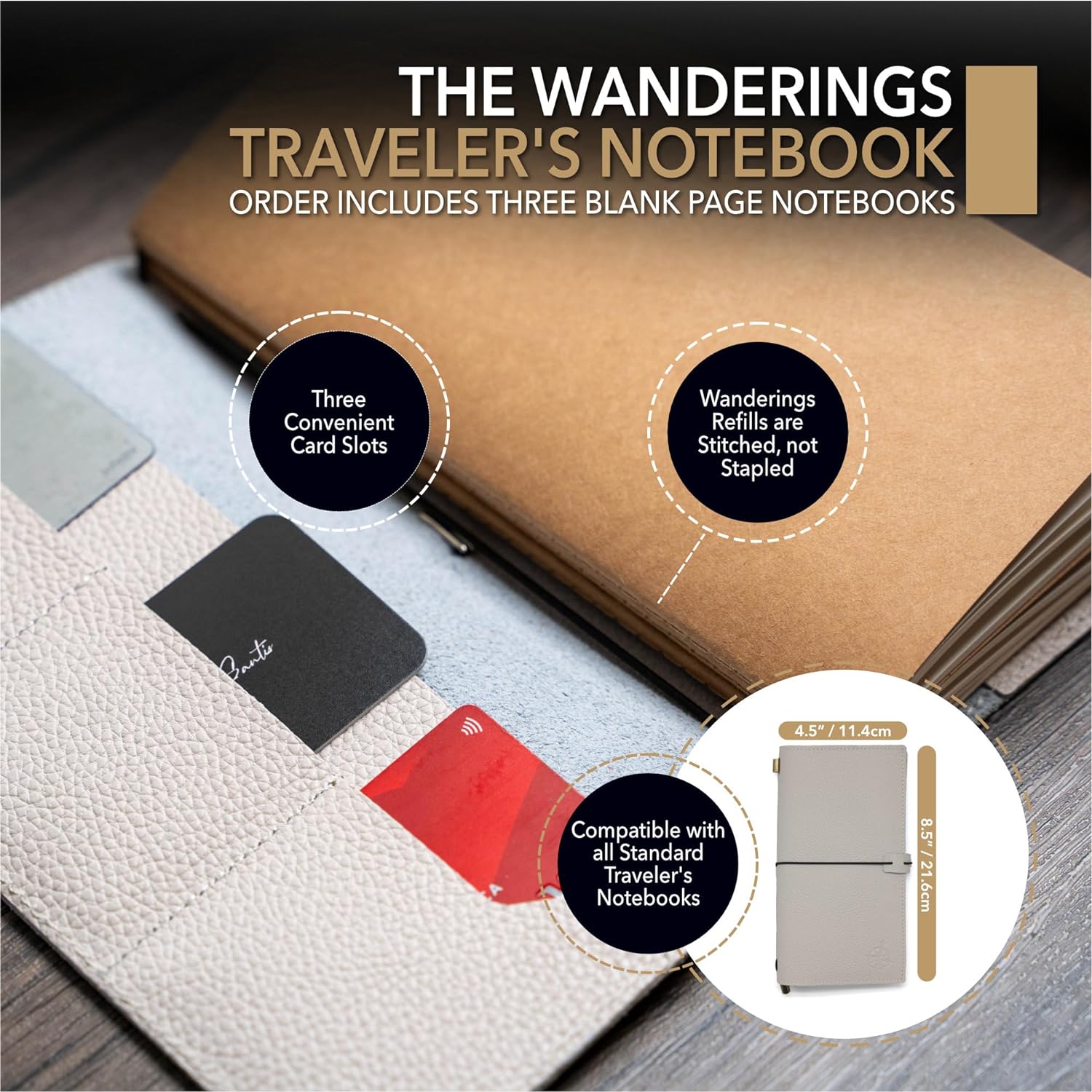 ✔️ REFILLABLE JOURNAL Buy this leather notebook organizer once and use it for a lifetime. Fountain Pen friendly paper for writing - includes 180 blank pages. Refills available on the Wanderings website HERE in Blank, Lined, Dotted, Grid, Assorted and Calendar.