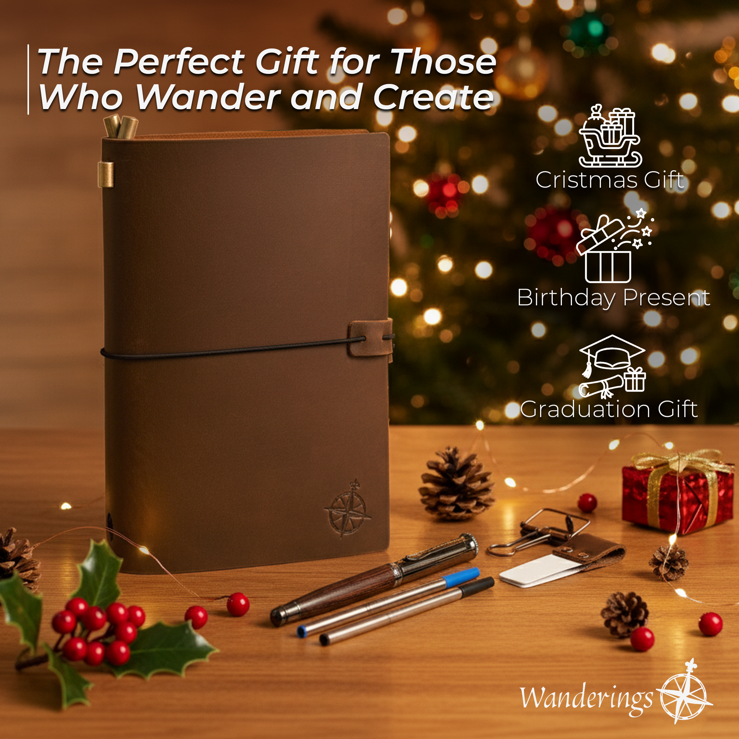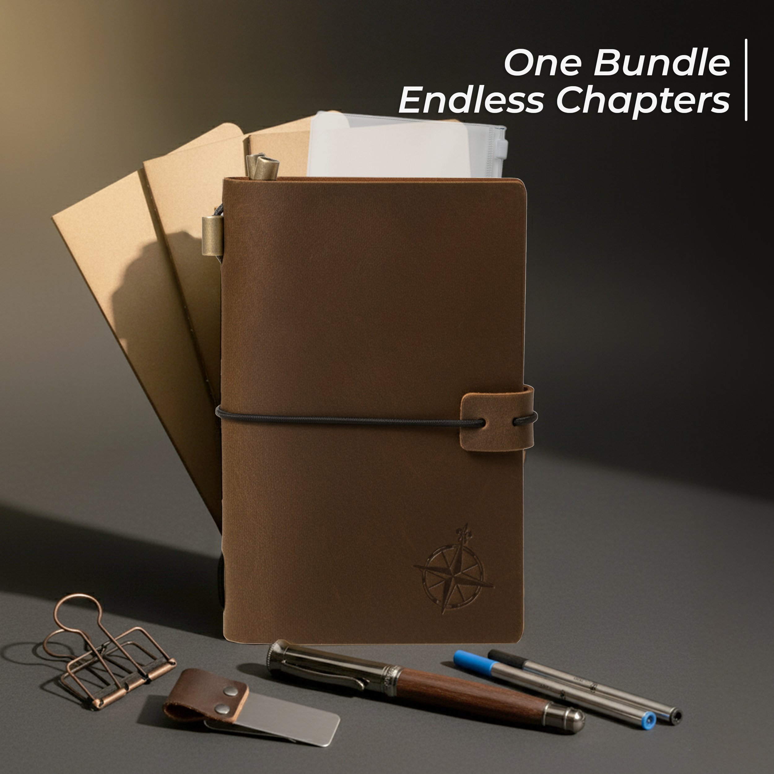 ✔️ [Complete Accessories Set]: This bundle adds the Wanderings refillable notebook with a convenient leather pen holder, a pen with 2 extra ink refills (3 ink refills in total), a clear PVC zipper folder for storing essentials, and a binder clip to secure your pages— designed for a fully equipped journaling experience.