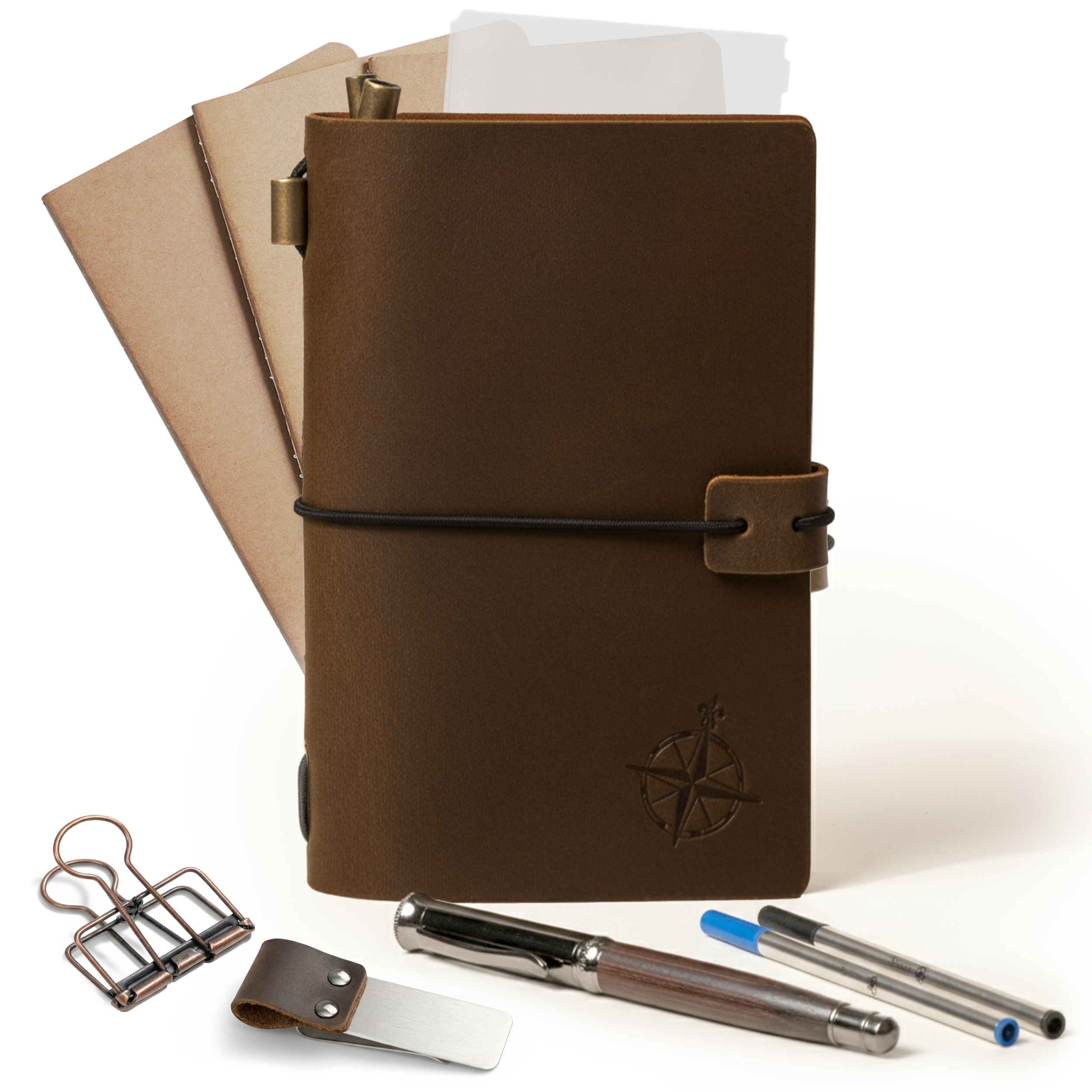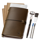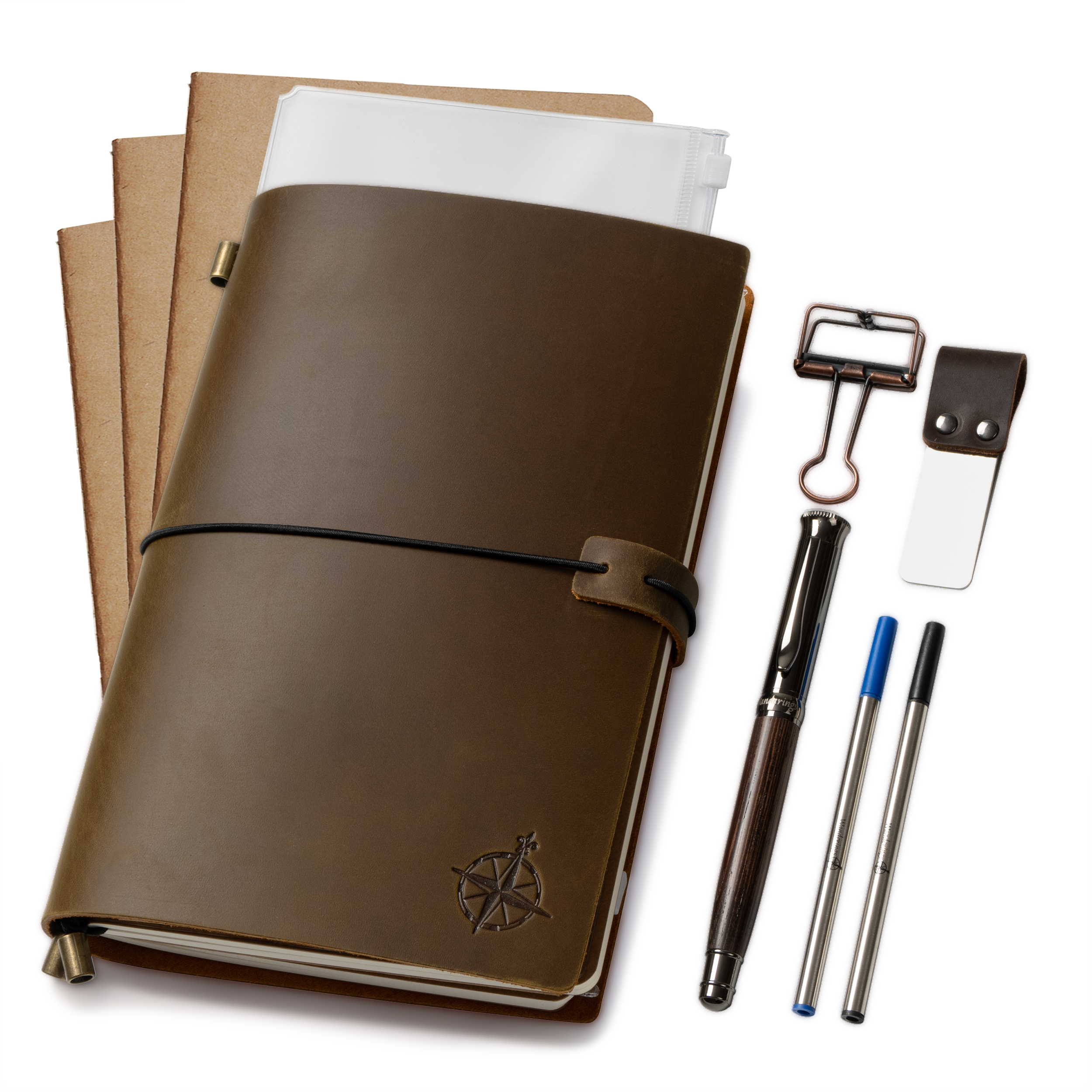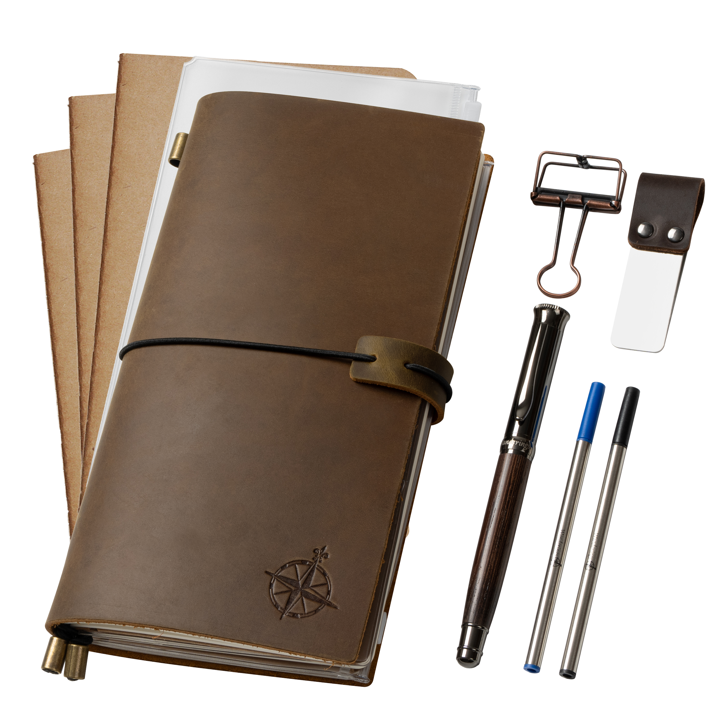 Travelers Notebook Bundle - With Pen Holder, Pen, 2 Extra Ink Refills, PVC Folder & Binder Clip - 3 Sizes