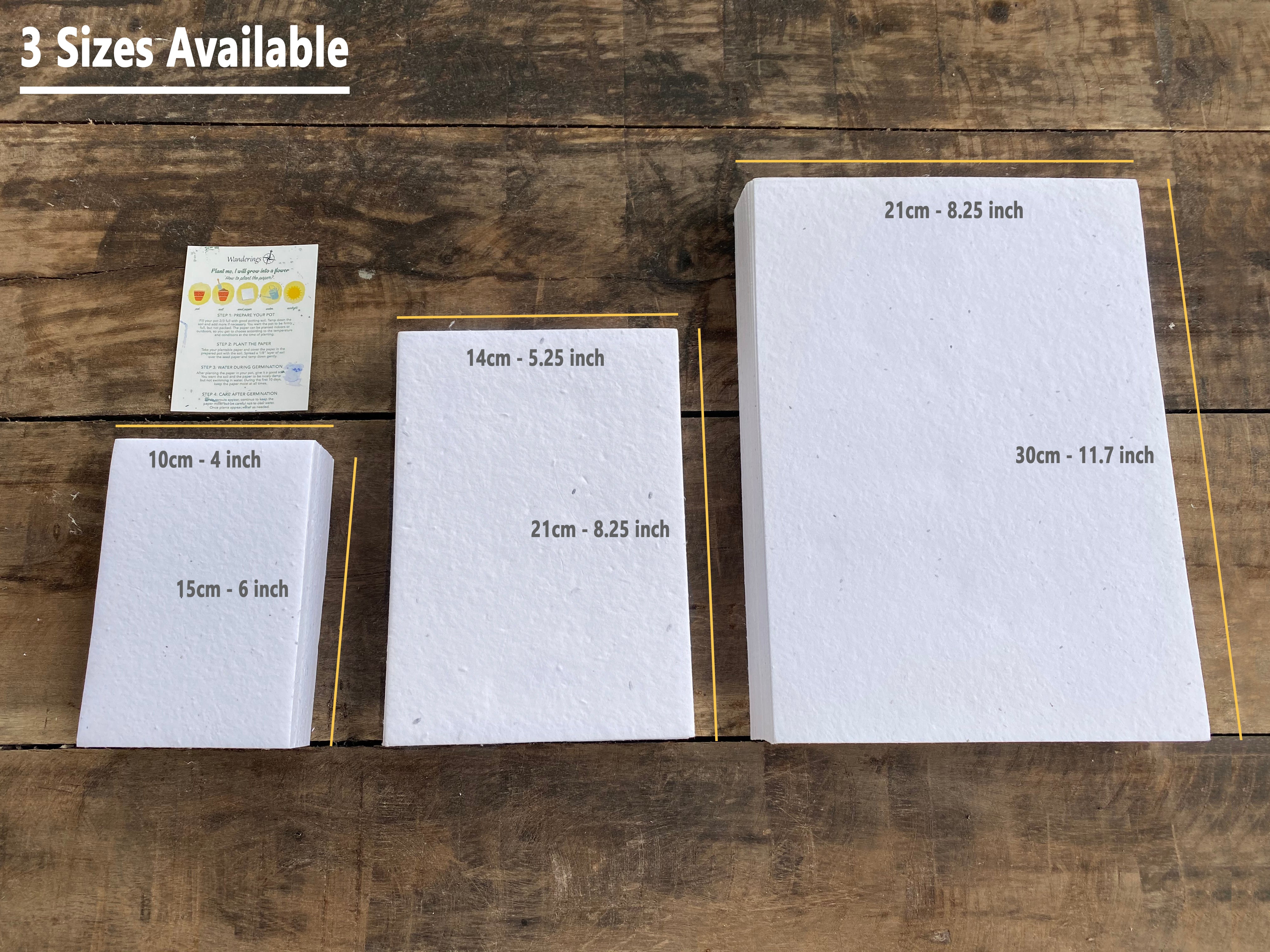 ✔️ AVAILABLE SIZES & STYLES – Choose from 2"x3.5" folded cards (25 cards), 5"x7" folded cards (25 cards), A6 4"x6" flat cards (50 sheets), A5 flat cards (50 sheets), A4 flat sheets (50 sheets), and 1.75"x3.75" gift tags (25 tags) – all made from our plantable seed paper.