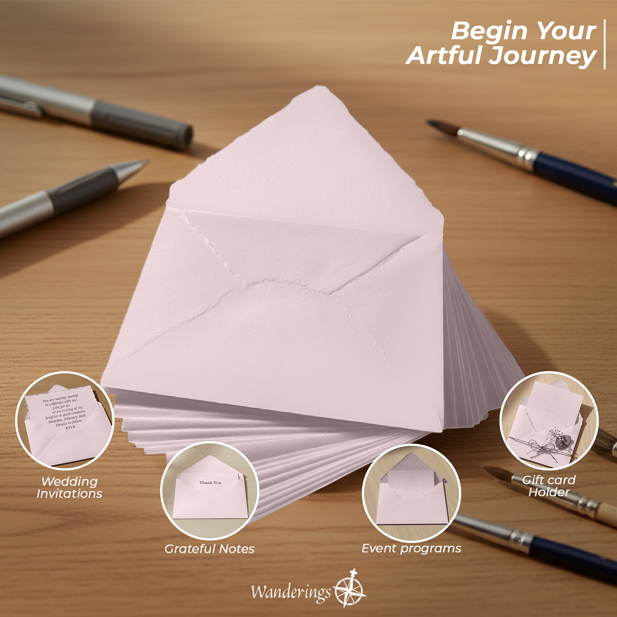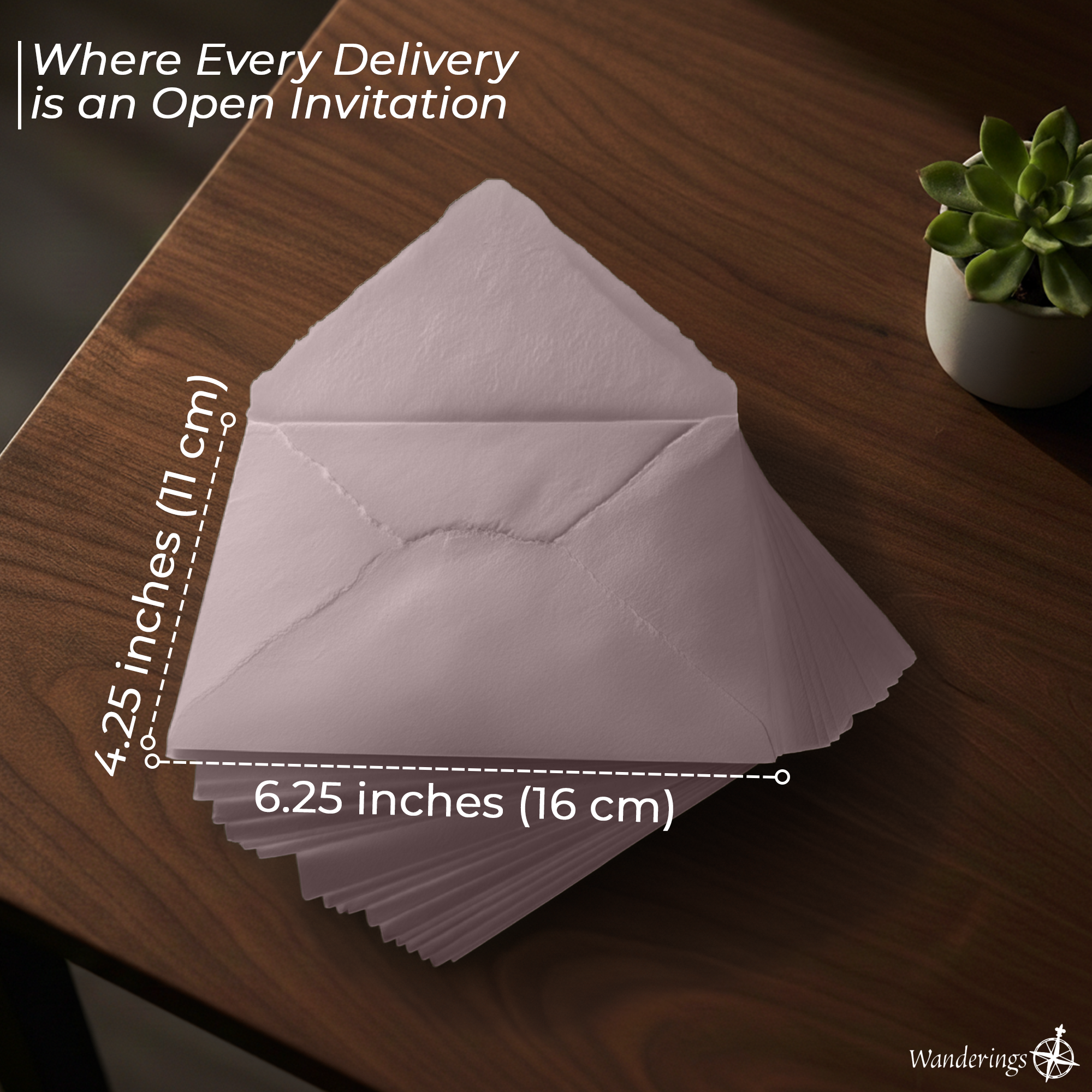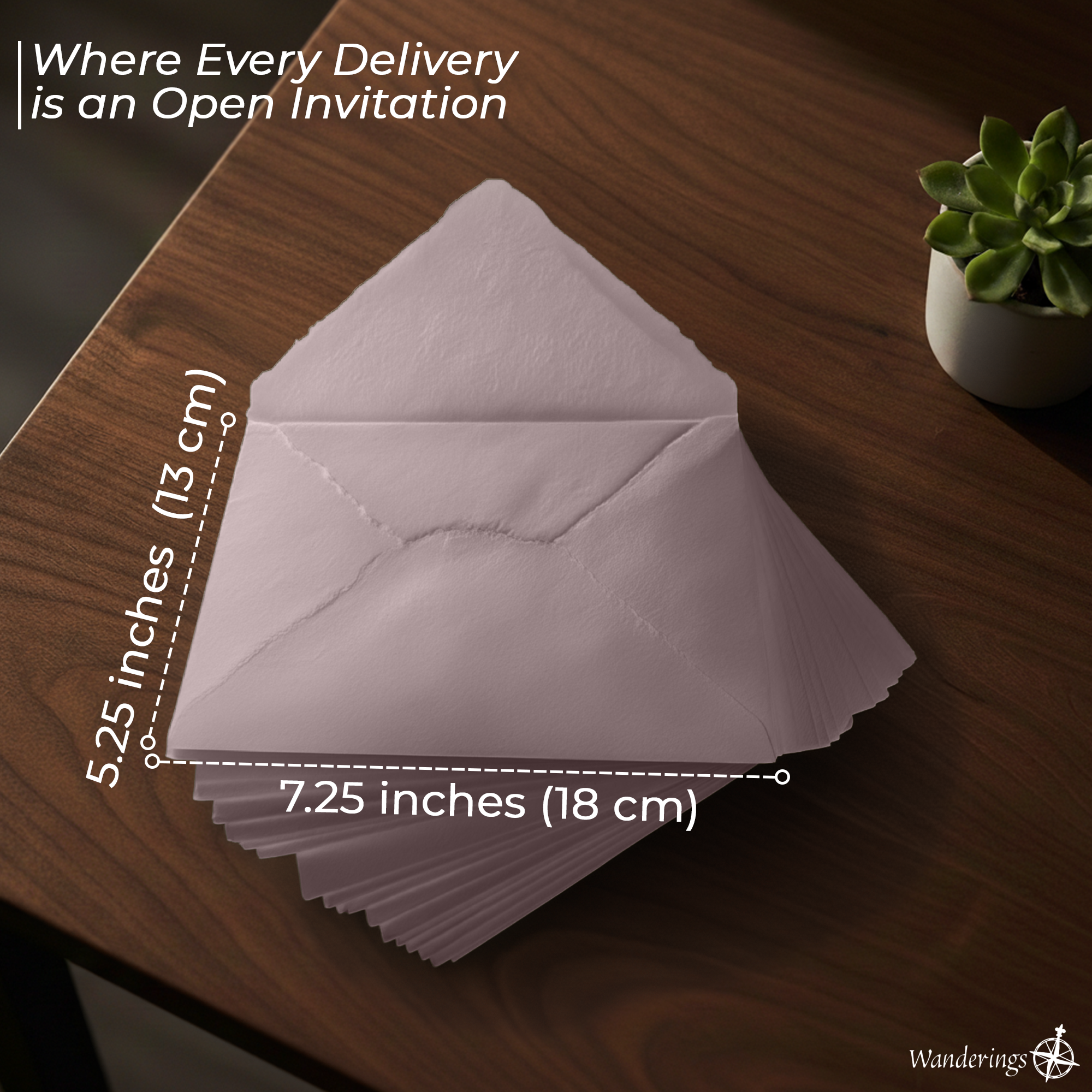 Nota: El papel y los sobres de Wanderings son hechos a mano, por lo que se pueden esperar ligeras variaciones en el tamaño.