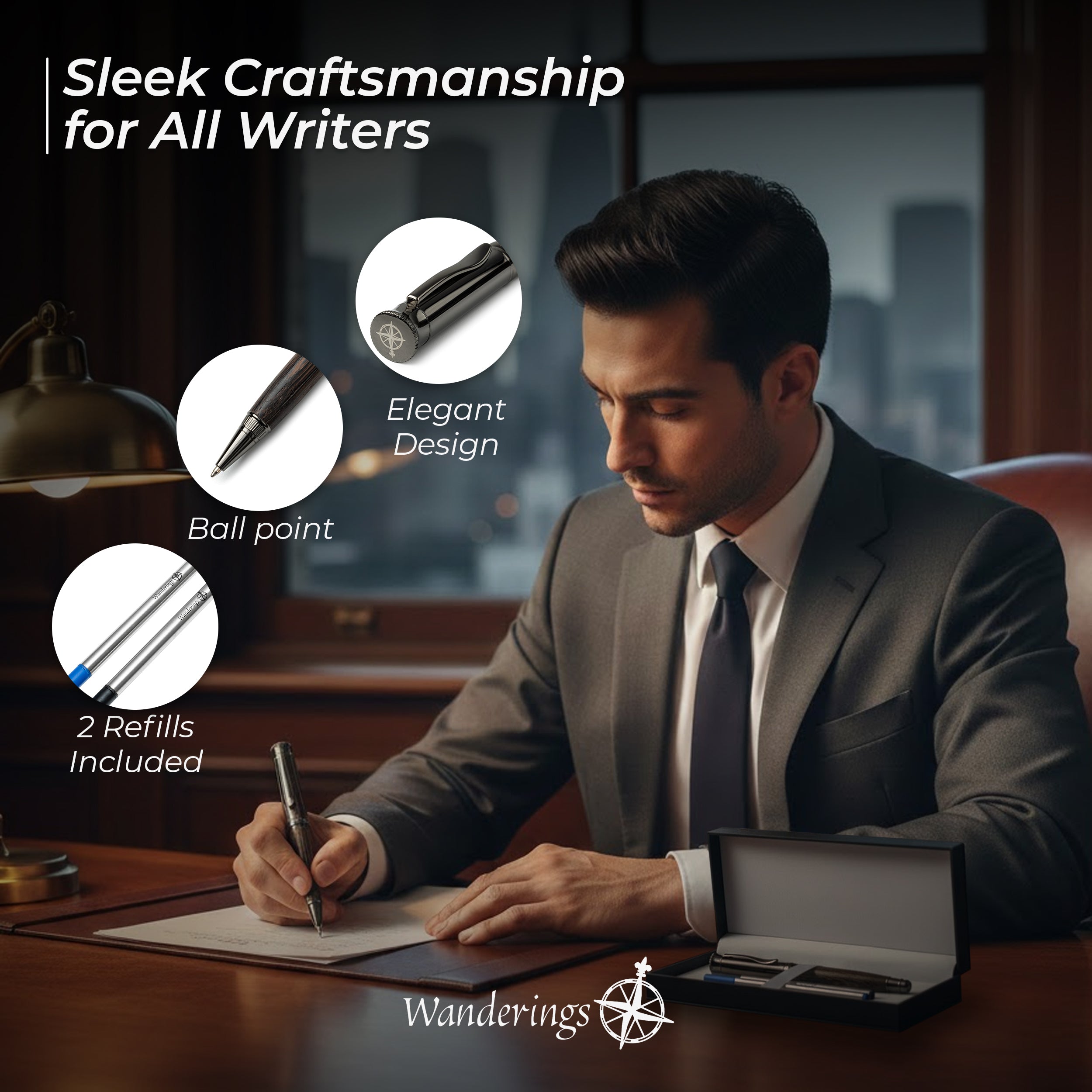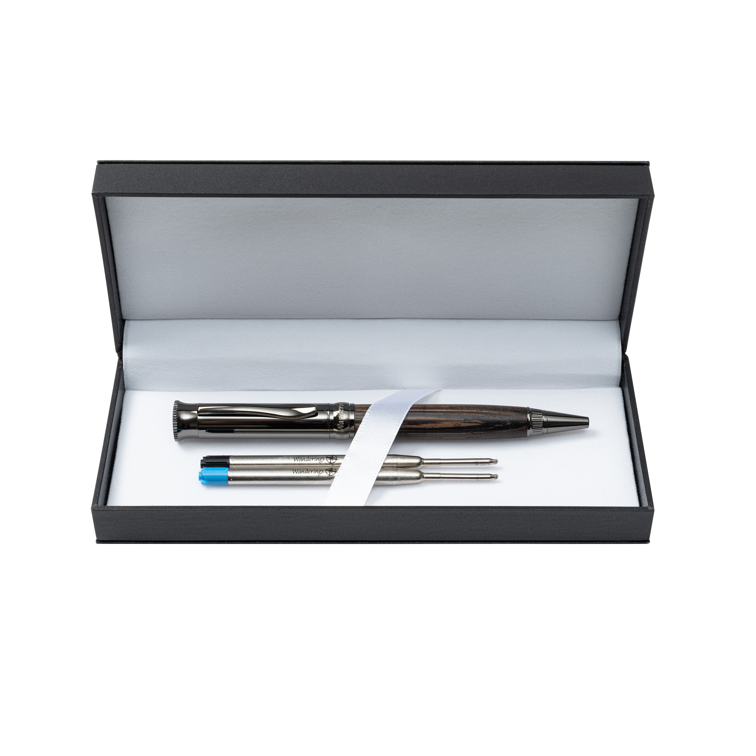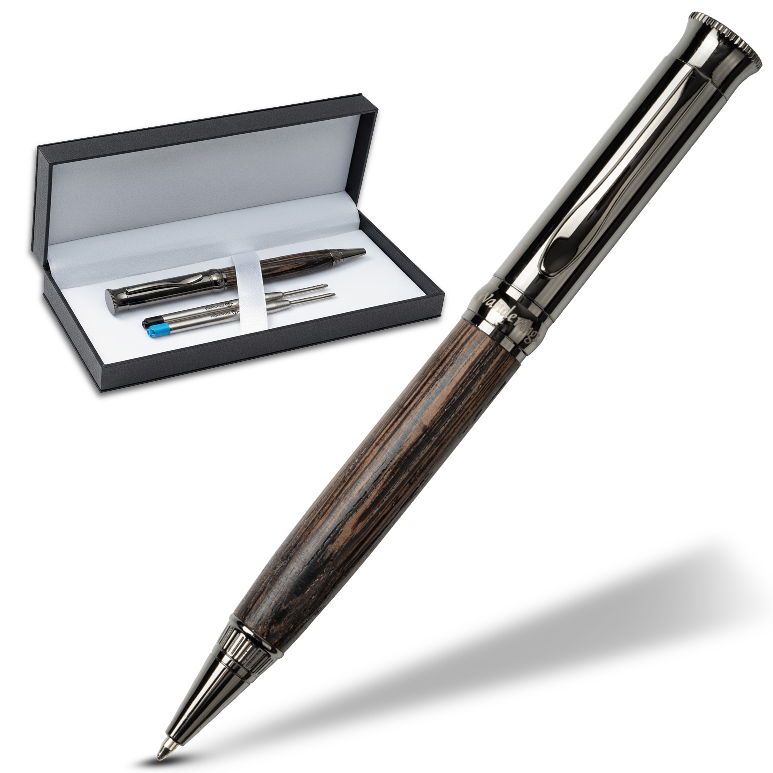 Wanderings Ballpoint Pen with German Ink – Beautifully Balanced for a Smooth Writing Experience - Gunmetal and Real Wood Barrel - Includes 2 Refills in a Giftable Presentation Case