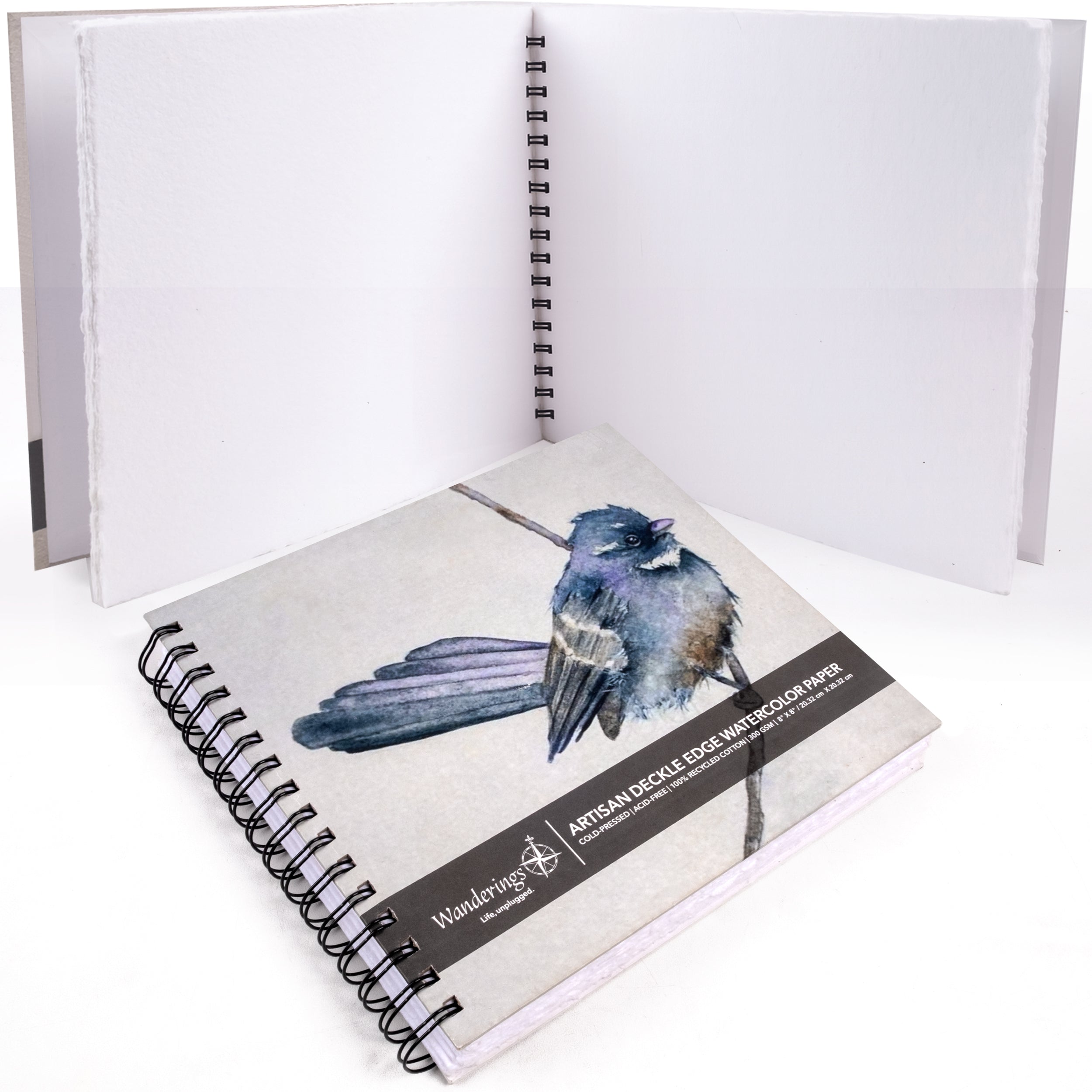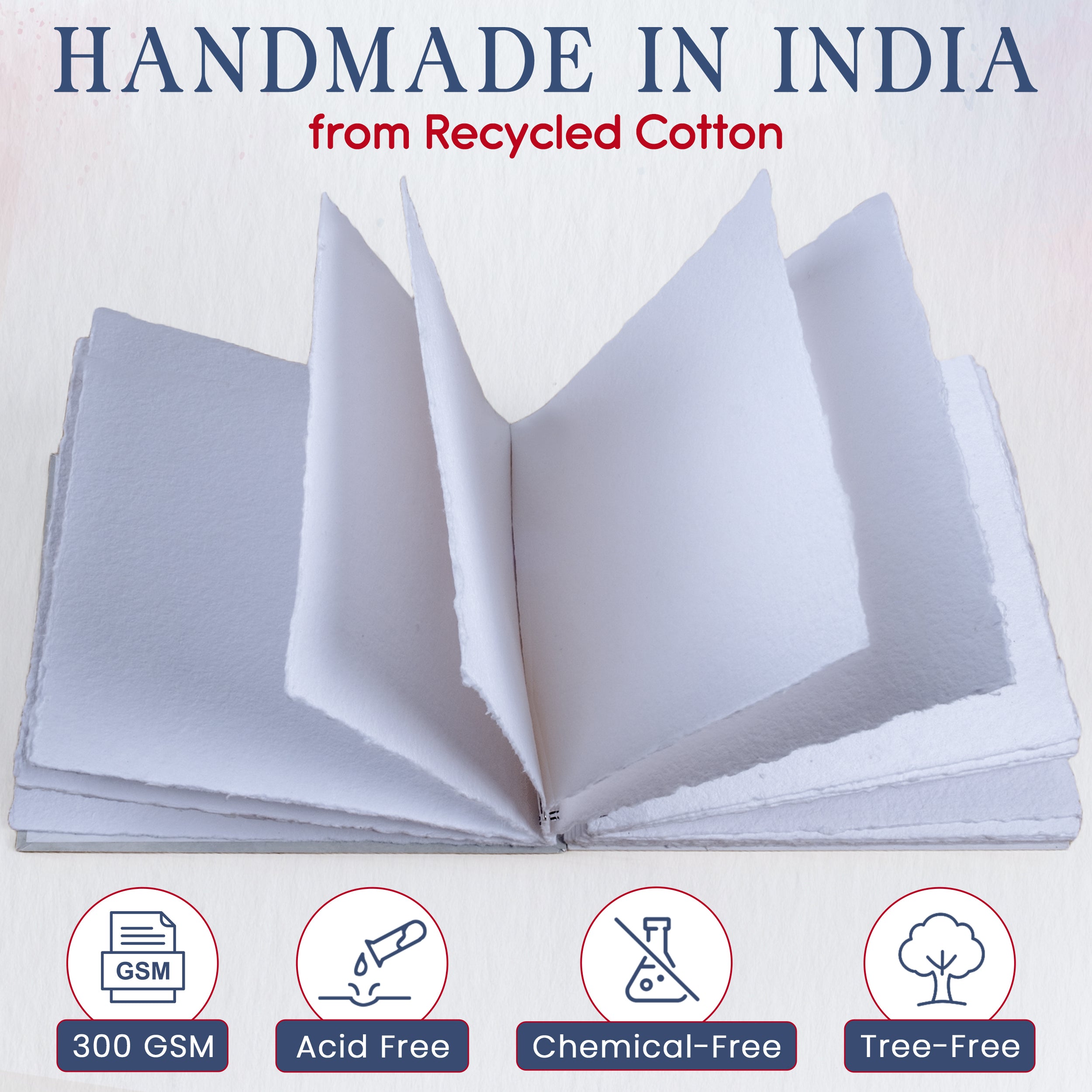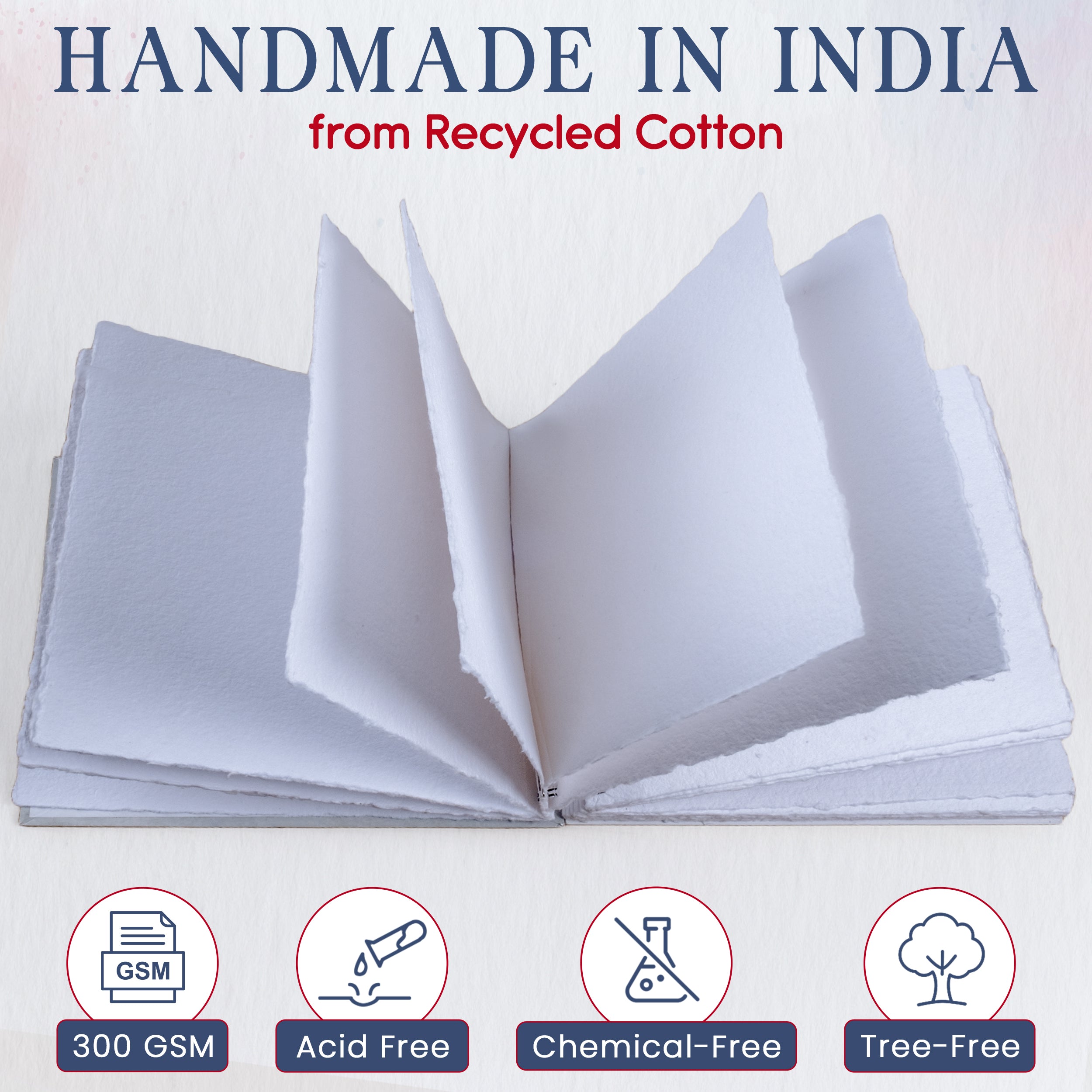 ✔️ 2 Sizes Available: 8"x8" (20cm x 20cm) and 9"x12" (23cm x 30cm). Beautifully handcrafted from high-quality 100% recycled cotton with tear-out pages for easy sharing, framing, or gifting your art – a lifelong companion on your journeys. Deckle Edge Paper - 44 pages (22 sheets) of white, cold press, 350 GSM recycled cotton paper that is acid-free, chemical-free and tree-free. Crafted by Indian Artisans and preserving a 1,000 year-old Indian tradition of papermaking by hand
