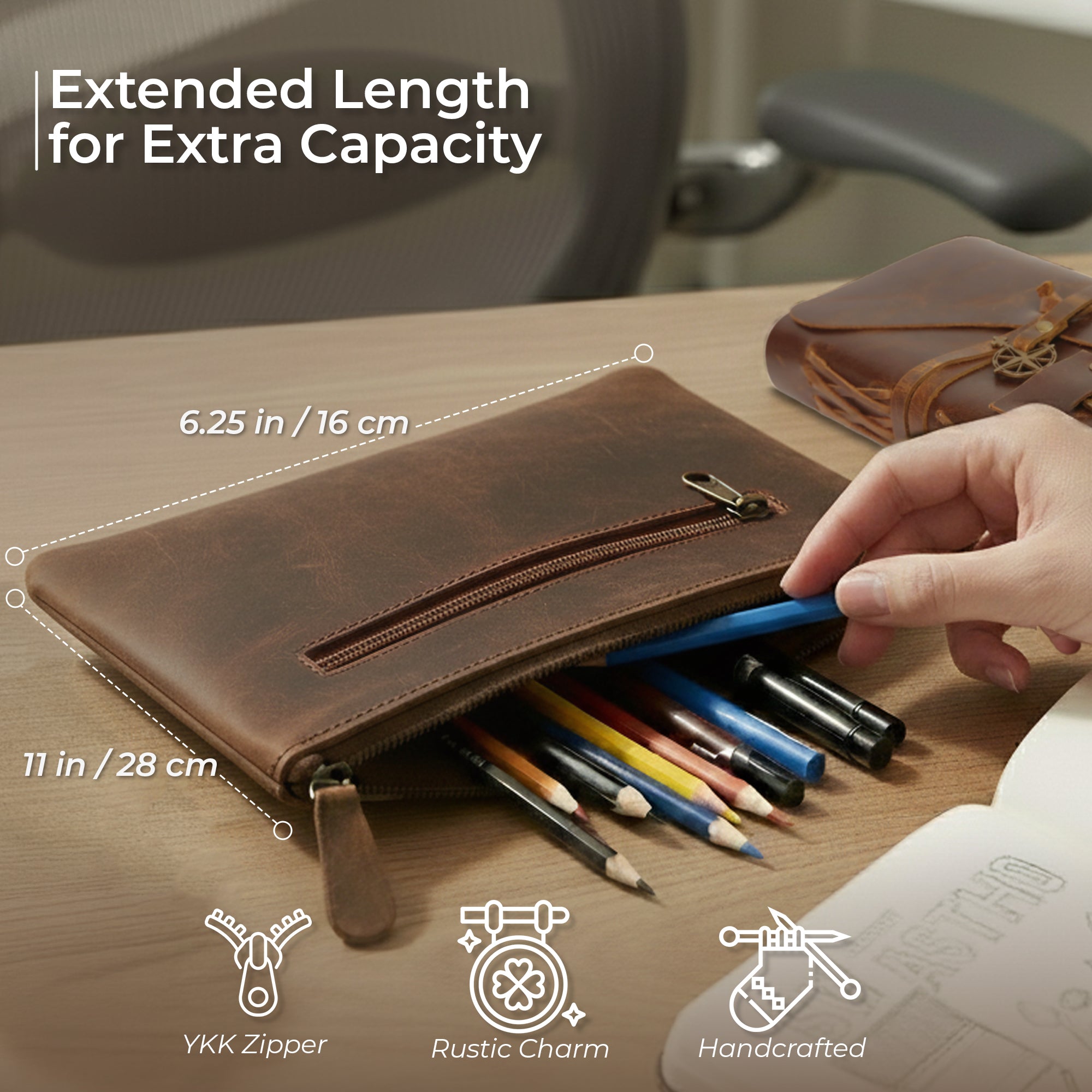 - A Timeless Leather Pouch with Zipper: This elegant and functional vintage leather pencil case is perfect for storing pens, markers, paint brushes, and pencils. Crafted from buffalo leather with a vintage design, artisanal craftsmanship, and distressed finish that improves over time. A thoughtful gift for men, women, artists, and anyone who values utility with style.
